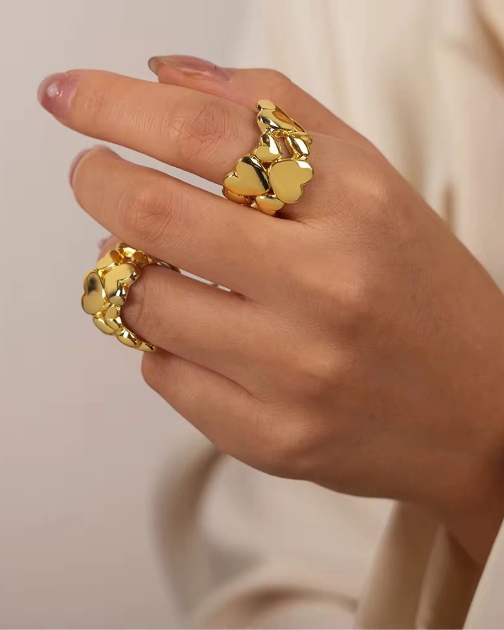 A: The Gloria Heart Ring features a bold, polished 18K gold-plated heart design, symbolizing love and elegance. Its adjustable size ensures a comfortable fit, making it a versatile piece that complements various styles.
